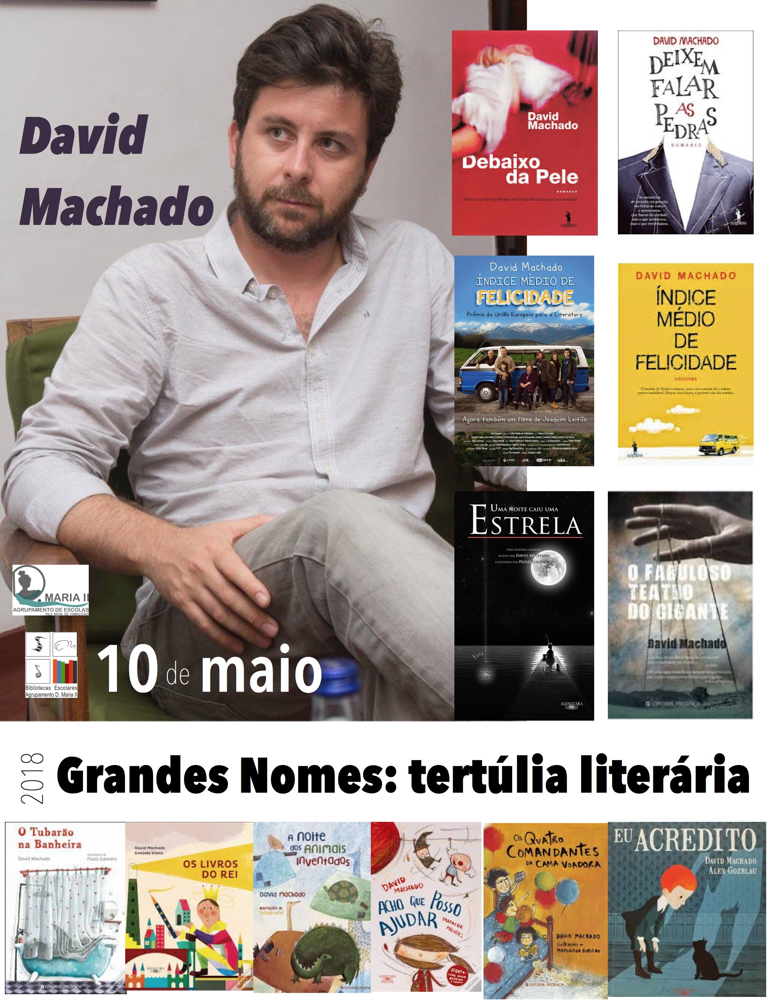 David Machado nasceu em Lisboa em 1978. Publicou os romances, O Fabuloso Teatro do Gigante, Deixem Falar as Pedras, Índice Médio de Felicidade (Prémio da União Europeia para a Literatura, Prémio Salerno Libro d’Europa) e Debaixo da Pele. Publicou, além disso, vários contos para crianças, entre eles, A Noite dos Animais Inventados (Prémio Branquinho da Fonseca 2005), O Tubarão na Banheira (Prémio Autor SPA/RTP 2010), A Mala Assombrada, Parece Um Pássaro, Eu Acredito, Uma Noite Caiu Uma Estrela e Os Livros do Rei. Os seus livros estão publicados em mais de uma dezena de línguas.